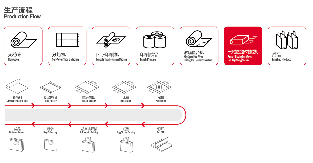 This machine is our latest design, always keep update. It can directly forming non woven box bag with loop handle autoamtically. The finished bag no need reverse. Its a perfect machine for win bag, drink bag, gift bag and shopping bag production.